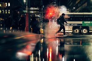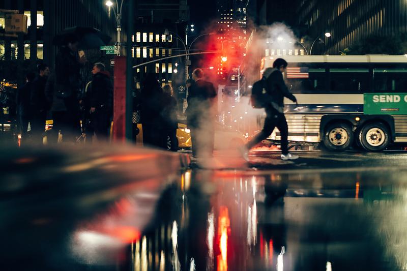 Rain steam and puddles on 49th street in Midtown Manhattan at night.